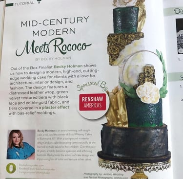 Top 10 Finalist for the Out of the Box Challenge by American Cake Decorating Magazine. I was given a prompt with client info, colors, style and materials. The challenge was to create a cake for the clients and write a tutorial for the magazine. So much fun!
